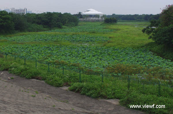 这是河岸边大堤内的湿地,应该是村民种植的食用莲耦,怕被盗和游客采摘,建起了围蔽铁丝网,盛花期时可远观成片荷花,而不可近距离接触。