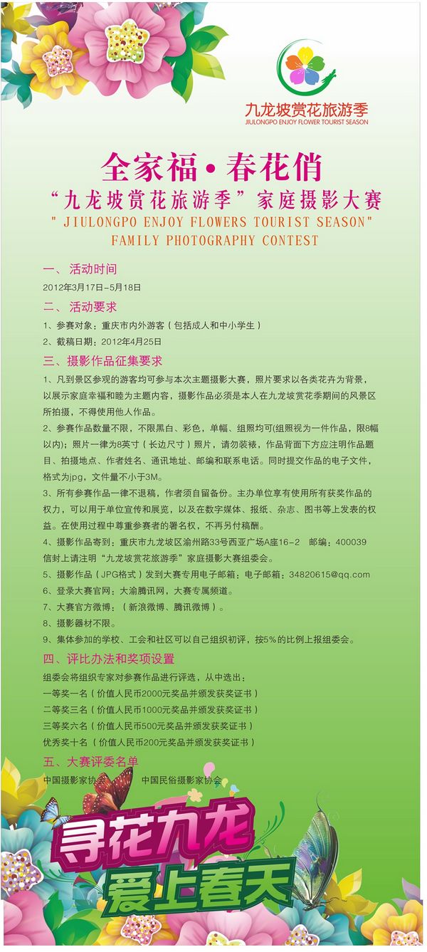 2012年3月17日~2012年5月18日,九龙坡区赏花旅游季组委会面向广大摄影爱好者,推出主题为“全家福·春花俏——九龙坡区赏花旅游季家庭摄影大赛”。大赛规定了拍摄内容必须是在九龙赏花旅游季期间的风景区拍摄,设立多级奖项,最高奖金达2000元。热爱赏花、热爱摄影的朋友均可报名参与。九龙坡区方面表示,希望通过本次活动使广大市民、游客通过“到九龙、游花坡”,更加直观地感受九龙坡的旅游新形象,领略九龙坡的美好春天。